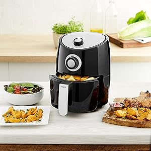 FRITEUSE À AIR CHAUD À COMMANDES MANUELLES : réglez facilement la température de cuisson jusqu'à 200 °C et ajustez la minuterie de 30 minutes en fonction de votre recette à l'aide des boutons manuels intégrés de notre friteuse électrique sans huile.